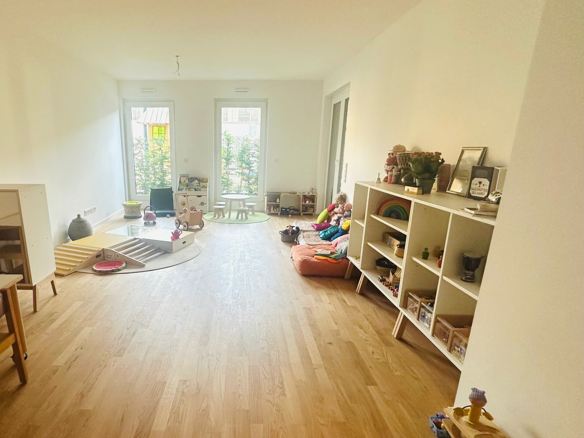 Ein heller, einladender Raum mit altersgerechtem Spielmaterial (z. B. Montessori- und Sinnesmaterialien, Bauecke, Küchenecke, Ruhe Ecke,