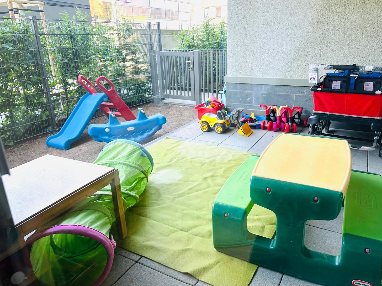 • Im Außenbereich (Garten): Hier haben die Kinder die Möglichkeit zu rutschen, zu wippen, Laufrad zu fahren oder die Natur mit allen Sinnen zu entdecken.